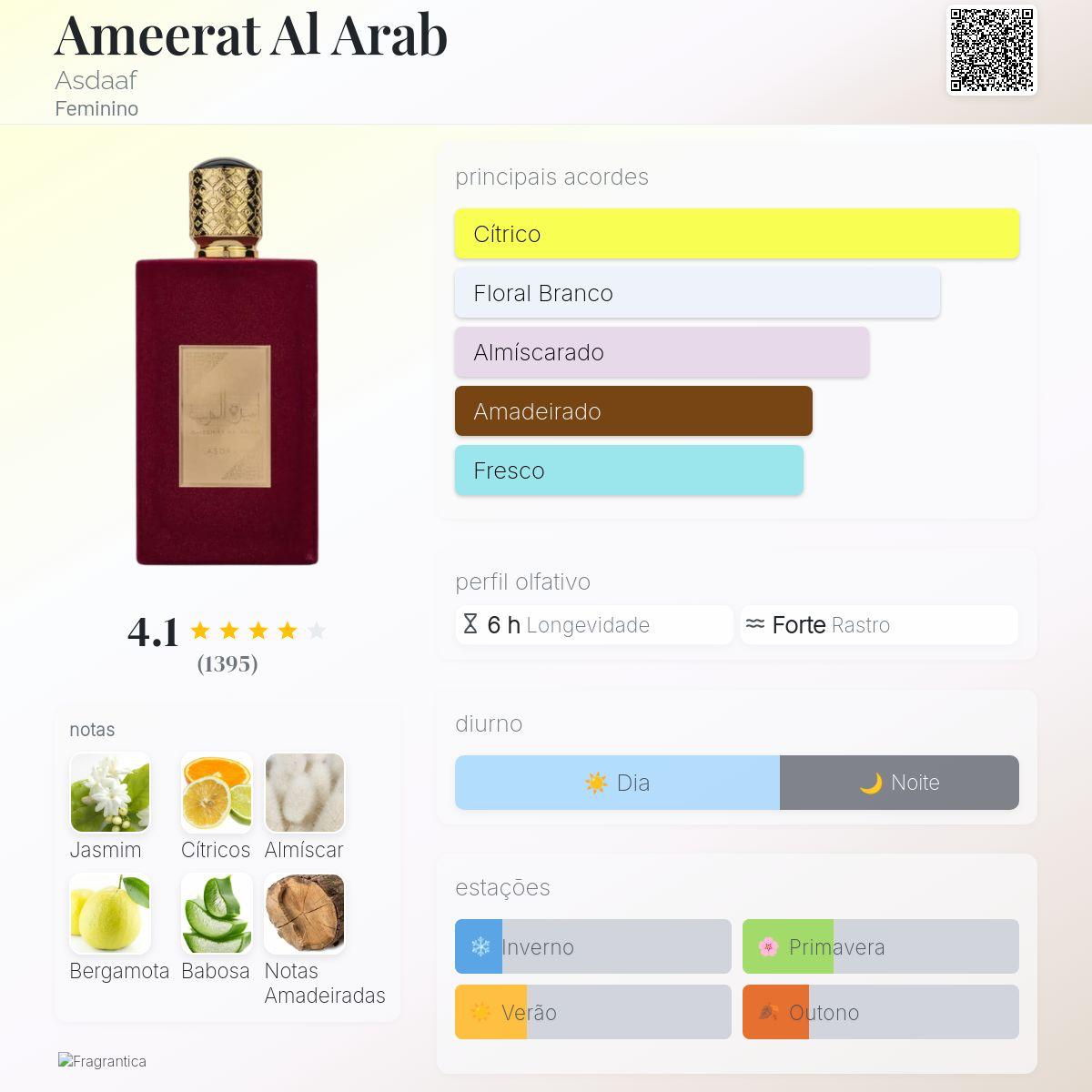 O Ameerat Al Arab é uma fragrância feminina sofisticada que combina frescor cítrico com a delicadeza das flores brancas. Sua abertura vibrante de notas cítricas e bergamota traz leveza e energia, enquanto o coração de jasmim revela feminilidade e elegância. No fundo, almíscar e notas amadeiradas criam um rastro envolvente e marcante.